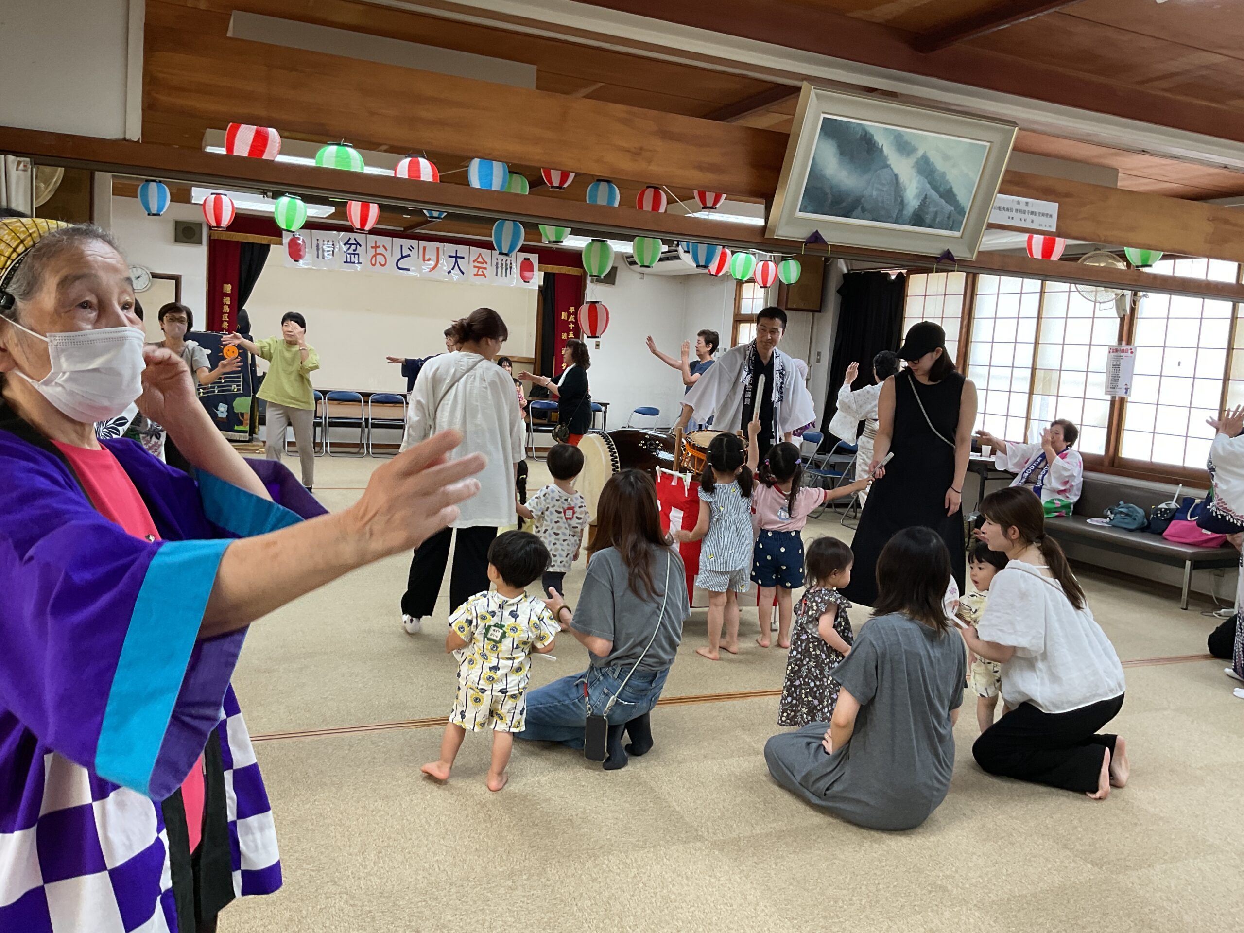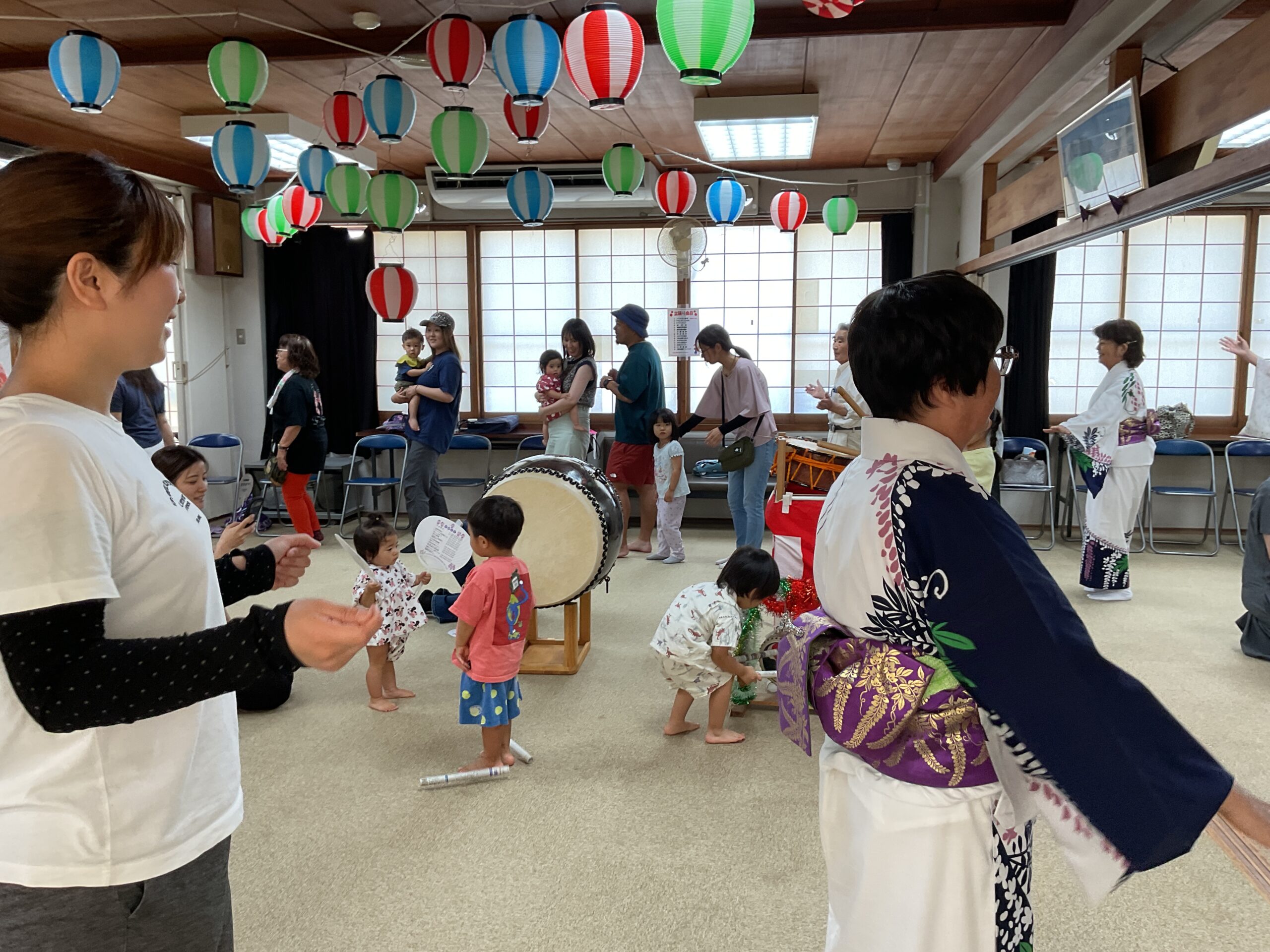 きらめきセンターの利用者さんの踊りの輪に入り動きを真似したり、太鼓を叩いたり、子どもも保護者も楽しむ様子が見られました。大人も子どもも笑顔で夏を満喫しました♪