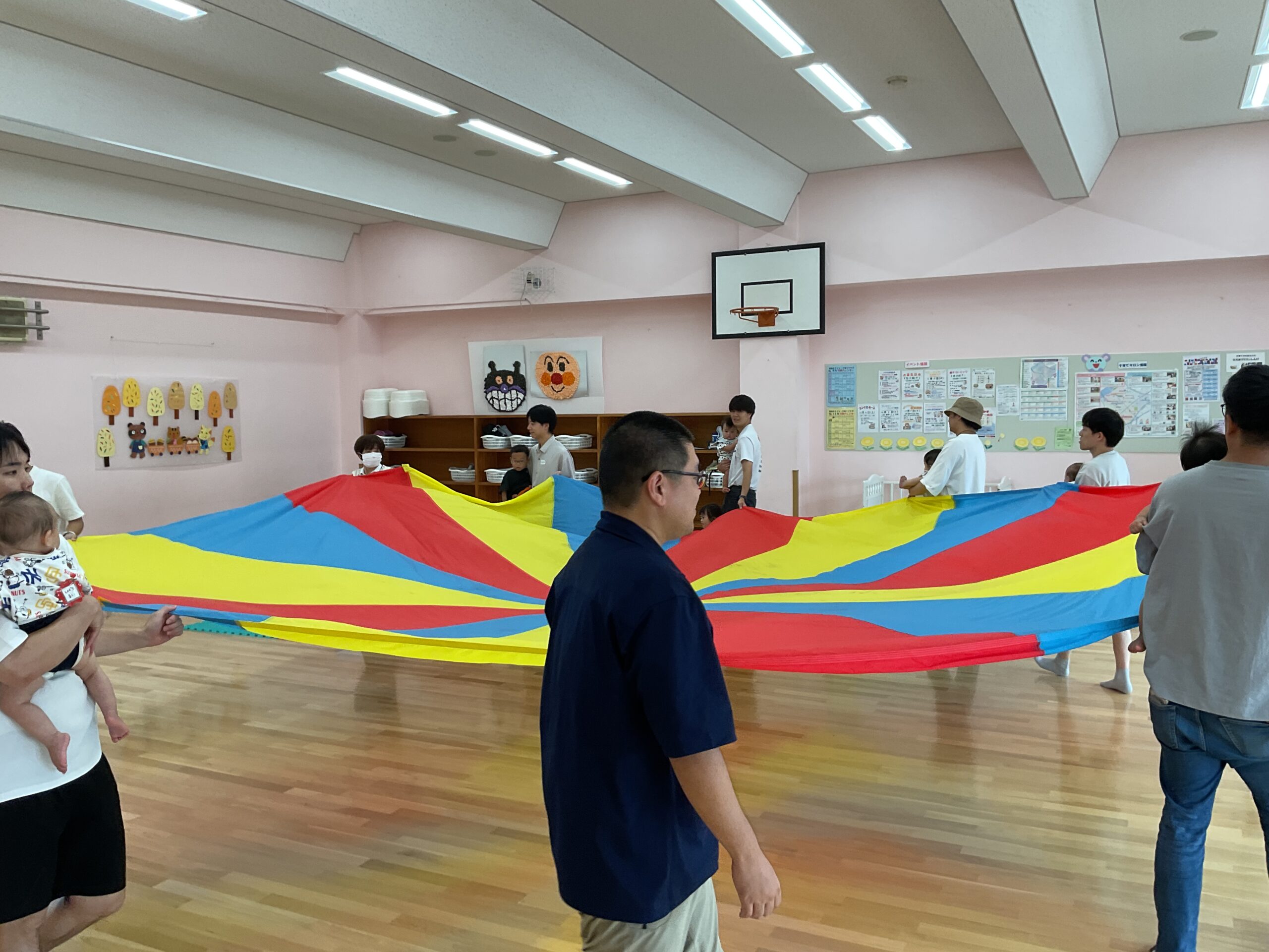 『パパの交流会』では「他の子の様子を見れて良かった。」「悩み事の共有や相談ができて良かった。」「悩みを体験された先輩パパの話が聞けて良かった。」の声があり、パラバルーンやサンサン体操など体を動かす遊びでは笑顔いっぱいでした。