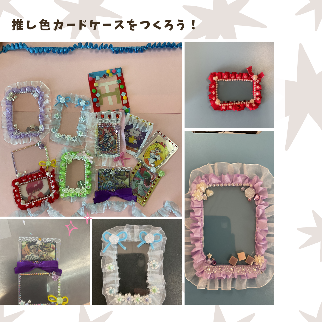 「推し色カードケースをつくろう!」では、6名の児童と子どもボランティア2名が参加し、オリジナルのケースを作っていました。好きな推しのカラーのパーツを飾り、可愛くデコレーションしていました!